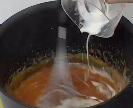 Once you get the desired color, take the sauce pan off the stove and add the heavy cream while whisking at the same time. Then add the butter, a tablespoon at a time and the sea salt.