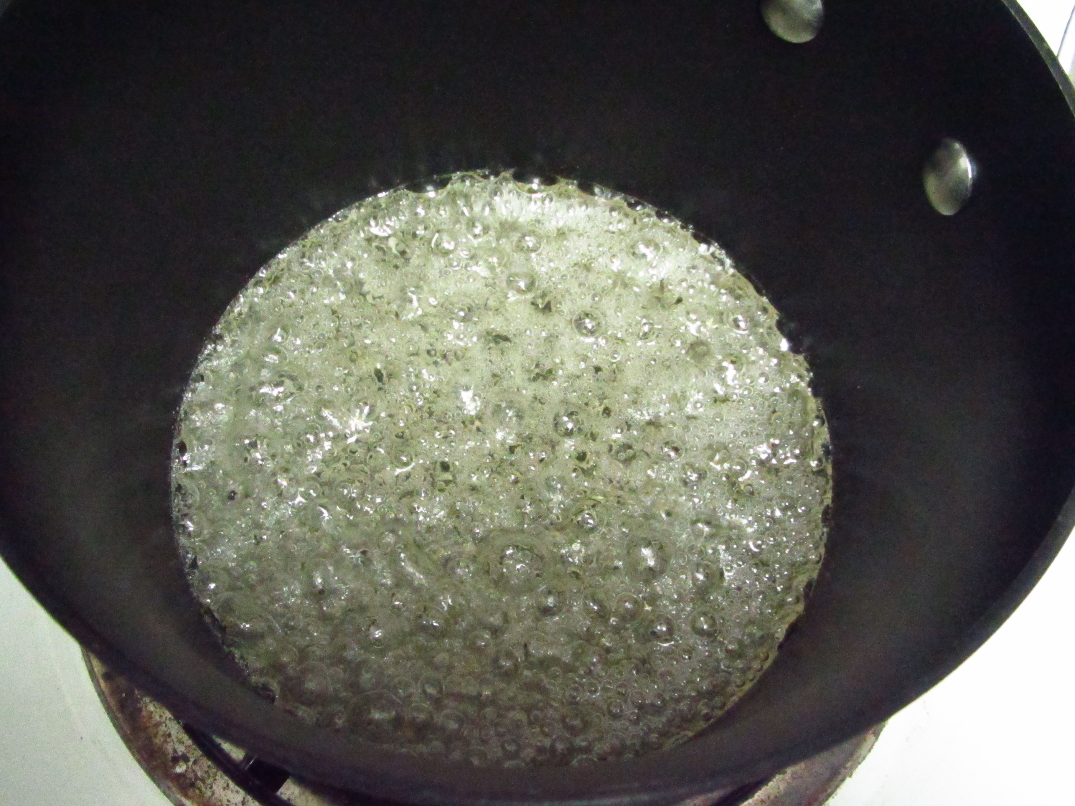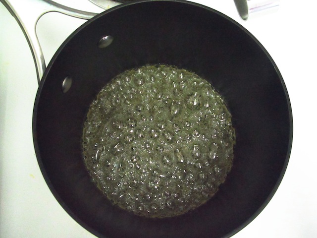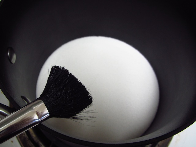The mixture will then start to boil. After the water is boiling off you take the wet pastry brush, again, and wipe the sides of the saucepan, getting rid of all those sugars and liquids that danced off the boiling liquid. Wipe all the way down, almost to the boiling sugar, but don’t touch it!