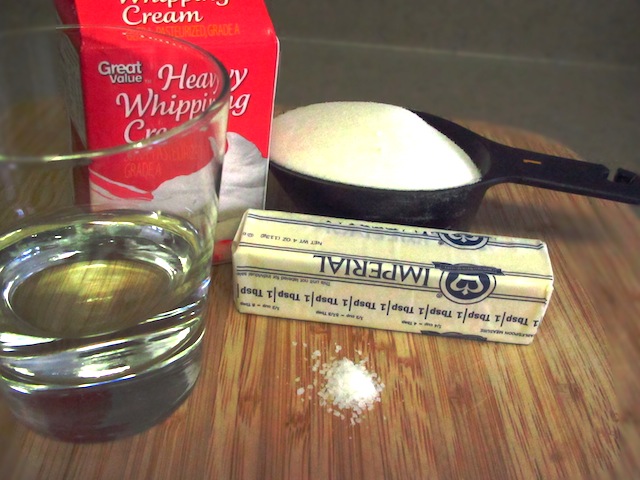 Sugar, water, butter or margarine, heavy cream and sea salt