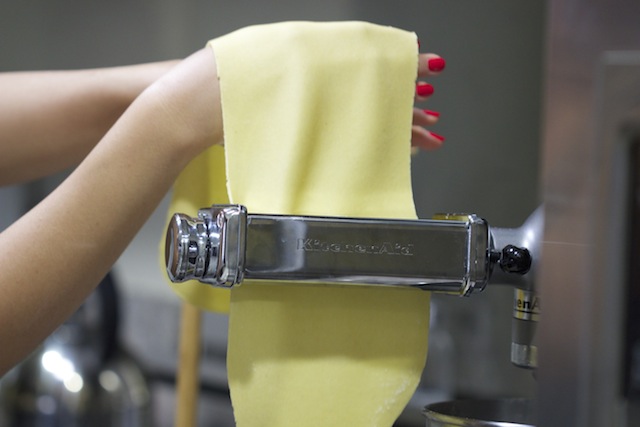 Then if you wish to make fettuccine or spaghetti, use the cutter attachment to cut the sheets into the desired thickness or cut the pasta by hand on the counter top with a chef’s knife to whatever size strands or shapes you want.