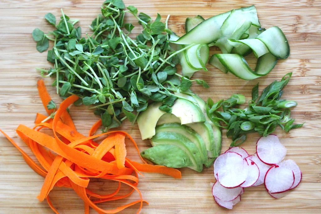 You can use brown rice, quinoa, or any other grain that you like, just remember to season it. 🙂 As for the toppings? Go wild if you want. You can make it vegetarian, strictly fish, even chicken if you want (Even though that would defeat the purpose of the “sushi” bowl and I would totally roll my eyes if someone used chicken, so even though I said it was okay, it’s not. But that’s none of my business) 🙂 I like to stick with some of the traditional vegetables and fish found in sushi. But everything is optional, so by all means go rogue just don’t tell me you used chicken. Keep that between you and yourself… please.